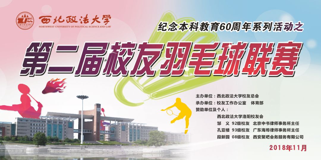 为活跃我校各地校友的文娱生活,加强校友之间的联络与沟通,提升西法大校友的凝聚力,11月17日至18日,西北政法大学第二届校友羽毛球联赛在我校长安校区体育馆举行。本次联赛作为我校纪念本科教育60周年系列活动之一,由校友总会主办,校友工作办公室和体育部联合承办。