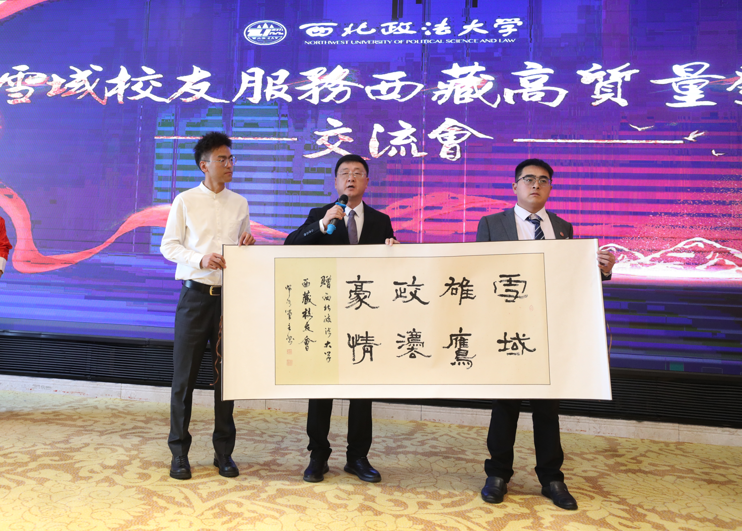 国内合作与校友工作处处长、校友总会秘书长刘霖杰宣读《关于西北政法大学西藏校友理事会换届工作的批复》,并代表学校向西藏校友会赠送由姚喜平教授专门创作的书法作品。