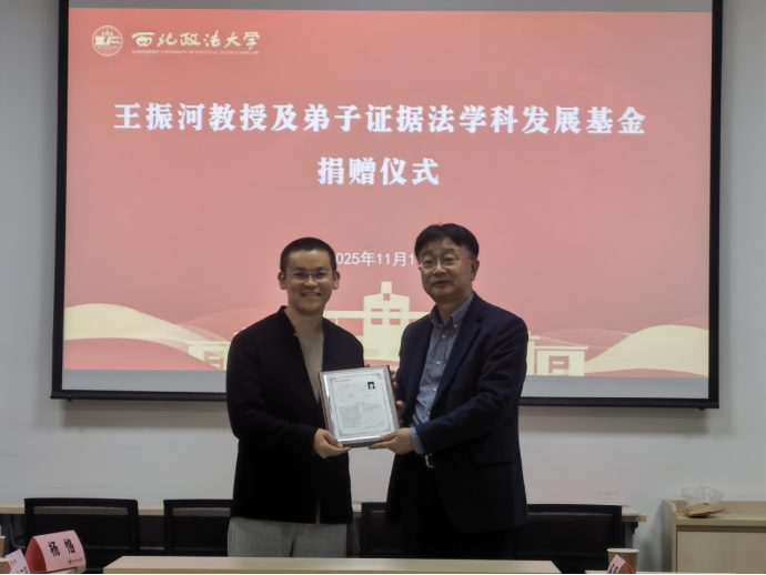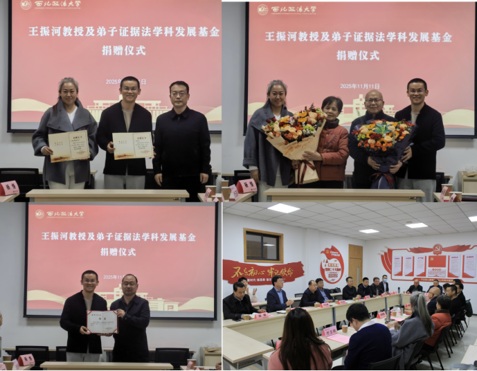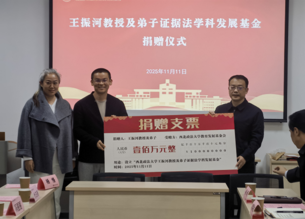 11月11日下午,“王振河教授及弟子证据法学科发展基金”捐赠仪式在我校雁塔校区一号教学楼隆重举行。校长范九利、副校长赵全宇,王振河教授与夫人侍秀英老师,基金设立者杨锦炎校友及夫人冯丽丽女士,校内师生代表共同出席,见证这一传承师道初心、凝聚校友情谊的重要时刻。