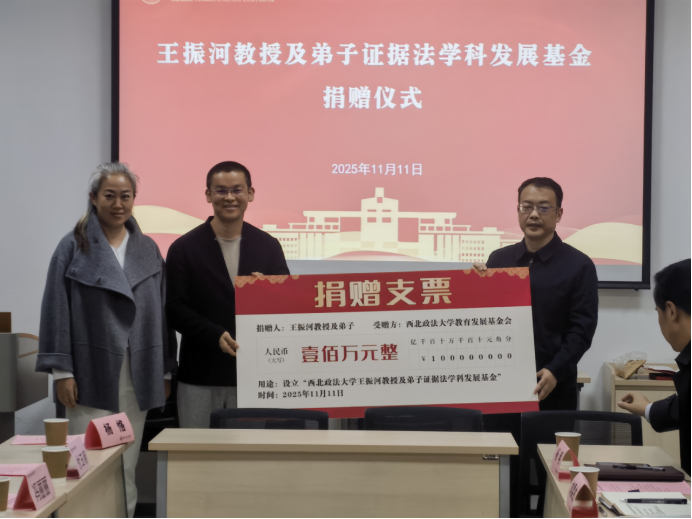 11月11日下午,我校接受校友捐赠正式设立“王振河教授及弟子证据法学科发展基金”,并在雁塔校区一号教学楼隆重举行了基金的捐赠仪式。校长范九利、副校长赵全宇,王振河教授携夫人侍秀英老师及其弟子代表,校内师生代表共同出席,见证这一传承师道初心、凝聚校友情谊、推动学科发展的重要时刻。