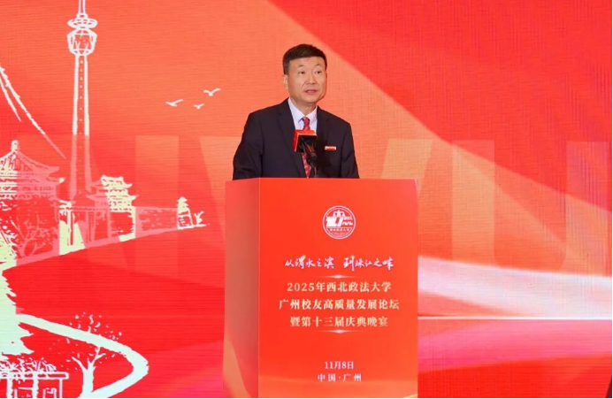 郭武军代表学校及校友总会祝贺活动成功举办,并介绍了学校在学科建设、人才培养、科研创新等方面的成效,肯定校友心系母校、助力发展的情怀与担当。他希望广州校友会及在穗校友创新机制、凝聚力量,在法治建设与行业深耕中传承西法大精神,为母校资源拓展、搭建合作桥梁,携手共进。