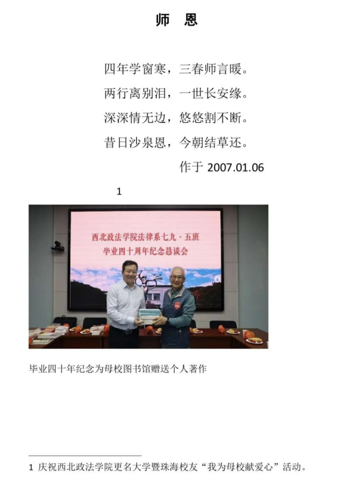 今特转发两篇佳作与全体校友共勉,愿大家在回望中共鸣初心、汲取奋进力量。诚邀每一位西法大人提笔抒怀,记录课堂点滴、恩师教诲、同窗情谊,或是走出校园后法治路上的坚守与感悟,让一个个鲜活故事串联起母校的温暖记忆,让这份深厚校缘与文脉绵延不息!