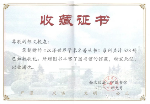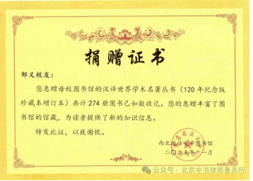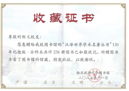2024年9月底,西北政法大学92级校友、北京中书律师事务所创始合伙人邹义律师向我校图书馆捐赠“汉译世界学术名著丛书”120 年纪念版·珍藏本·增订本近 300 种。至此,该丛书累计出版规模已达一千种。历经三次、持续数年的系统捐赠,圆满完成。