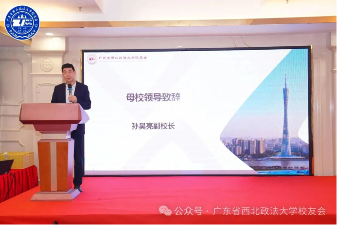在大会的主题分享环节,母校孙昊亮副校长代表学校对广东省校友会的工作给予高度肯定,他说:“广东省西北政法大学校友会作为我校校友会组织中屈指可数的获得注册审批的校友会,在组织建设、活动开展、校友联络、助力学校事业发展等方面,为学校校友工作规范、高效推进做出了标杆和示范。”随后,孙校长提几点希望和建议:一是做校友情谊的“凝聚者”,共筑同心奋进的共同体。二是做法治精神的“传承者”,彰显新时代的使命担当。三是做校地发展的“赋能者”,谱写协同共赢的新篇章。”