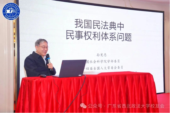 主题分享环节将大会推向高潮。校友会特邀第十四届全国人大常委会委员、中国法学会民法学研究会常务副会长、中国社会科学院学部委员、法学所一级研究员孙宪忠教授担任主讲人。孙宪忠教授以《我国民法典中民事权利体系问题》为题,为校友们带来了一场高水平的学术讲座。