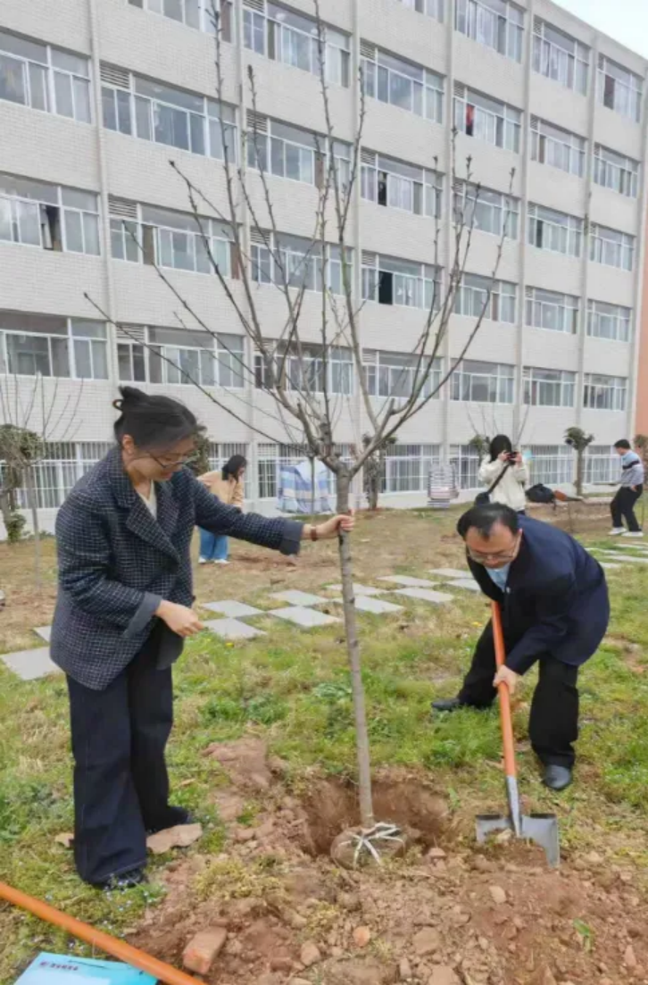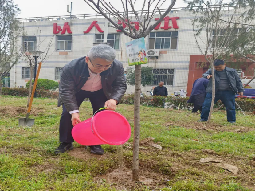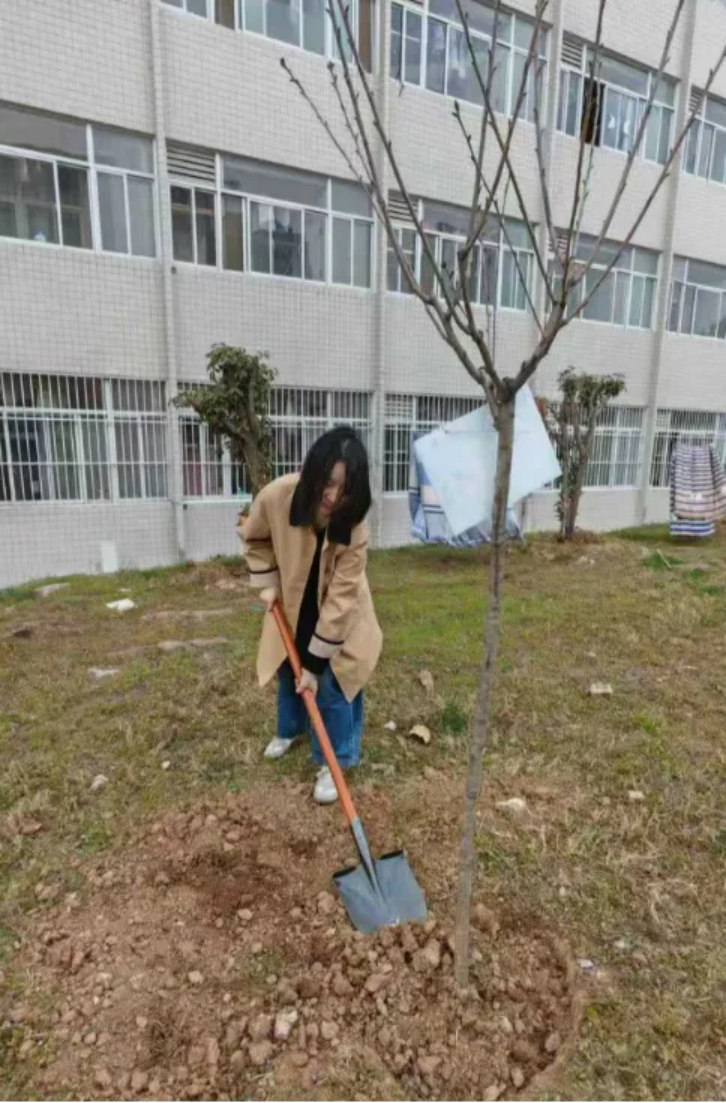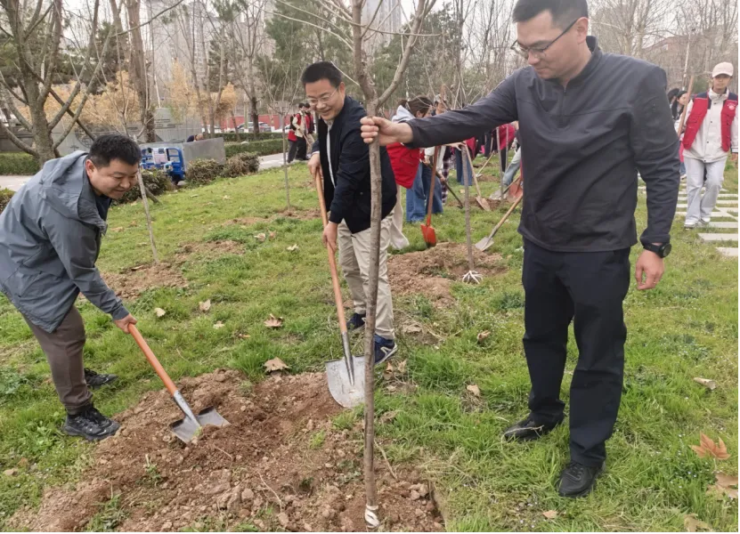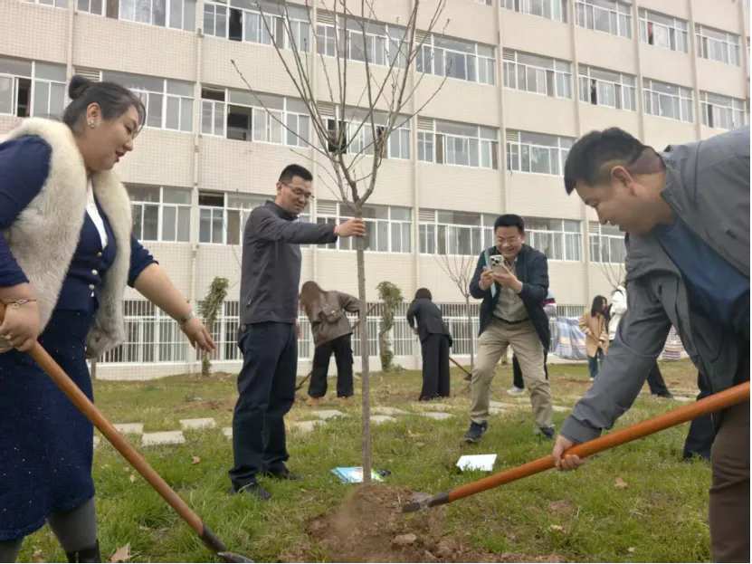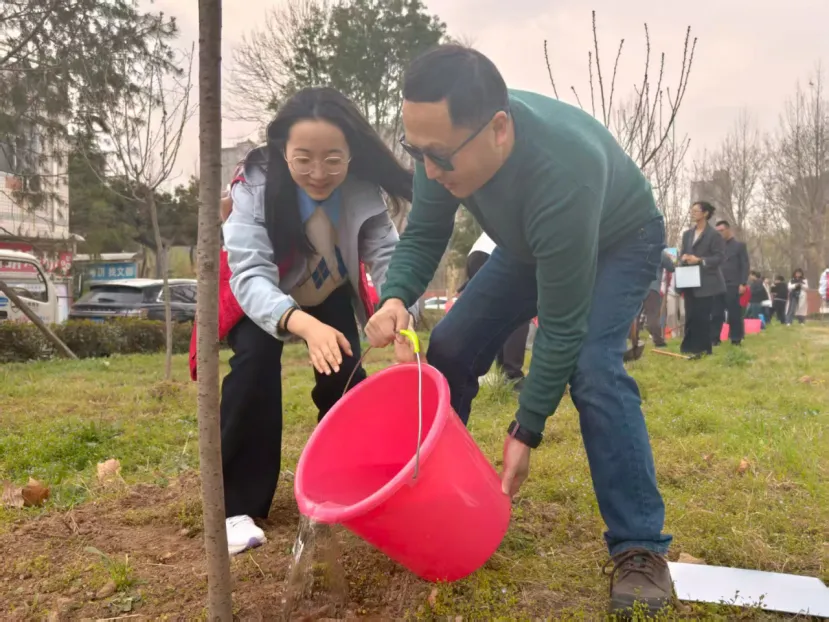 活动现场,暖意融融、干劲十足。校友们自发分组协作,挥锹铲土、扶苗培土、提水浇灌,分工明确、配合默契。有的校友细心扶正树苗,确保根系舒展、树形周正;有的校友奋力挥锹,将泥土均匀覆盖在树苗根部,压实踩牢;还有的校友提着水桶,缓缓浇灌每一株新苗,仿佛在呵护一份珍贵的希望。汗水浸湿了衣衫,却挡不住大家的热情,欢声笑语回荡在校园的上空,成为春日里西法大长安校区最动人的风景。